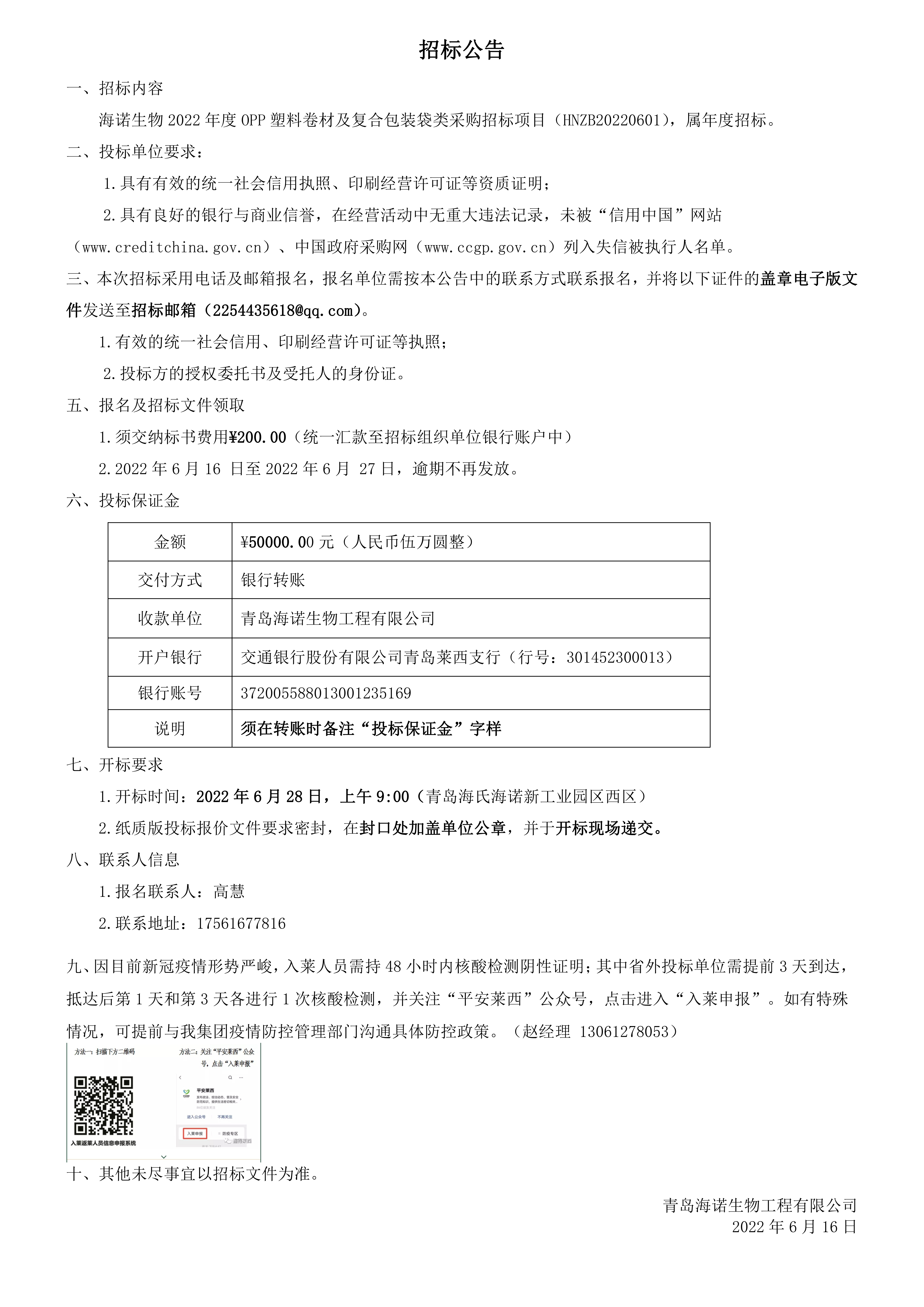 海诺生物2022年度OPP塑料卷材及复合包装袋类采购招标项目-招标公告